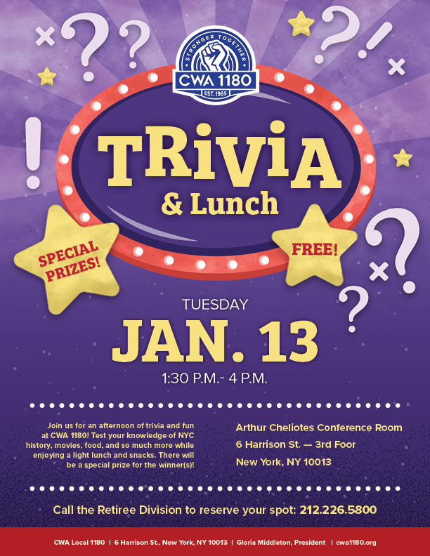 | Tues. 1/20 | IN-PERSON Review of Online Lessons / Q&A | 6 Harrison St. Call the Retiree Division to reserve your spot today: 212.226.5800 |