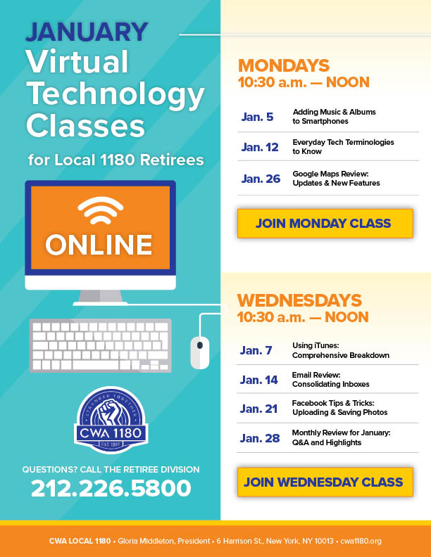 | Tues. 1/6 | IN-PERSON Review of Online Lessons / Q&A | 6 Harrison St. Call the Retiree Division to reserve your spot today: 212.226.5800 |