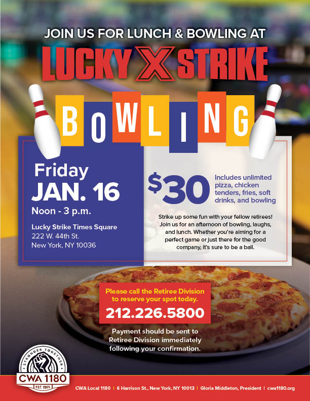 Fri.1/16 | Lunch & Bowling $30 includes unlimited pizza, chicken tenders, fries, soft drinks, and bowling | Lucky Strike Times Square Call the Retiree Division to reserve your spot today: 212.226.5800 |